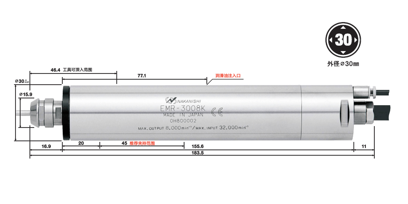 | EMR-3008K | 7869 | φ30 mm | 80000 min-1 | 1:4 | 32000 min-1 | 1μm以内 | CHK系列(φ0.5~φ6.35mm) | 350W | 650g |